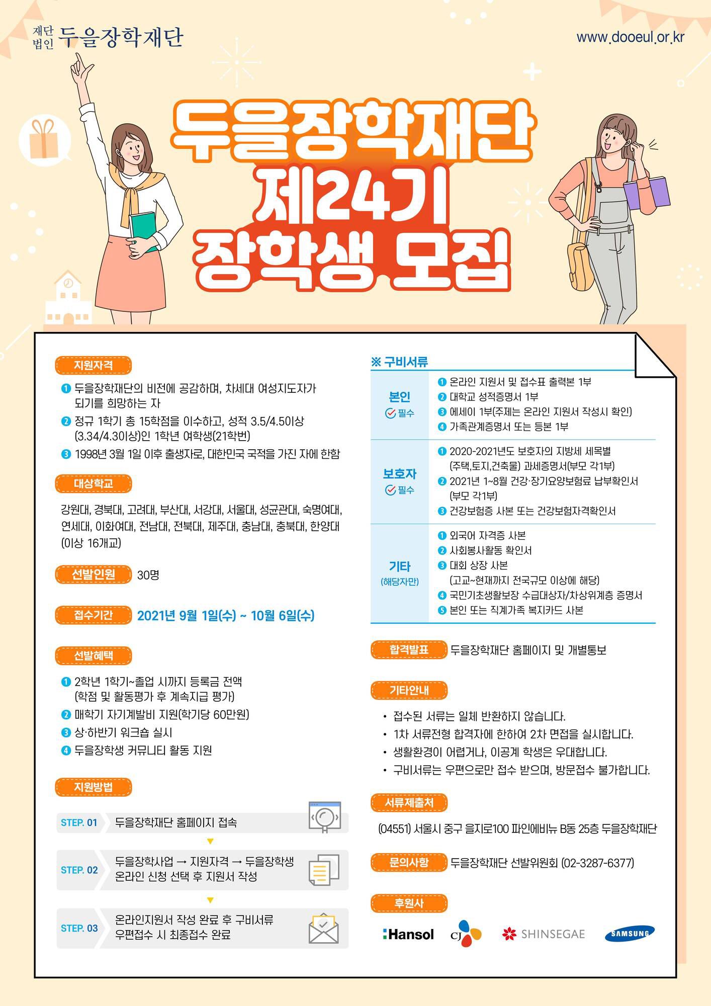 - 지원방법 : www.dooeul.or.kr → 두을장학사업 → 지원자격 → 두을장학생 온라인 신청