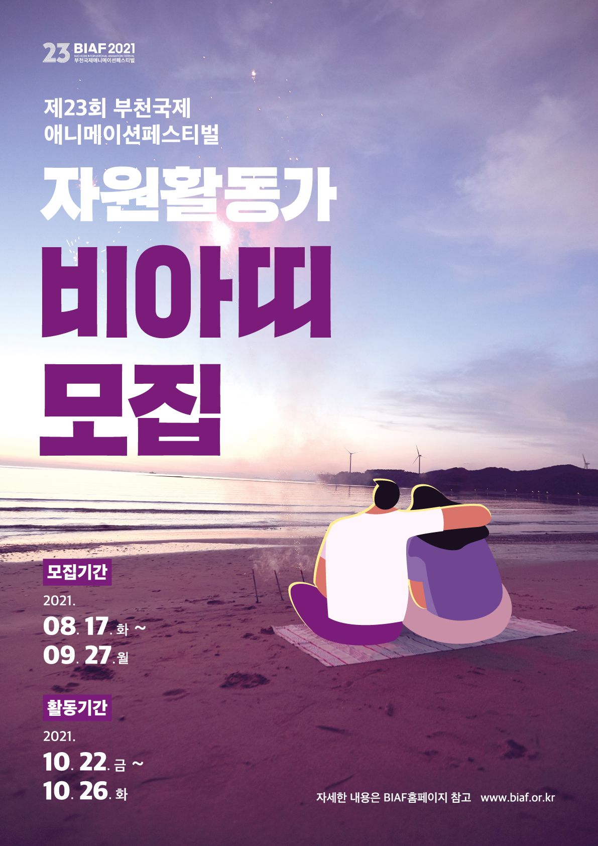 대한민국 첫 번째 아카데미(OSCARS) 공식지정 국제영화제인 제23회 부천국제애니메이션페스티벌(BIAF2021)에서 자원활동가 “비아띠”를 모집합니다.