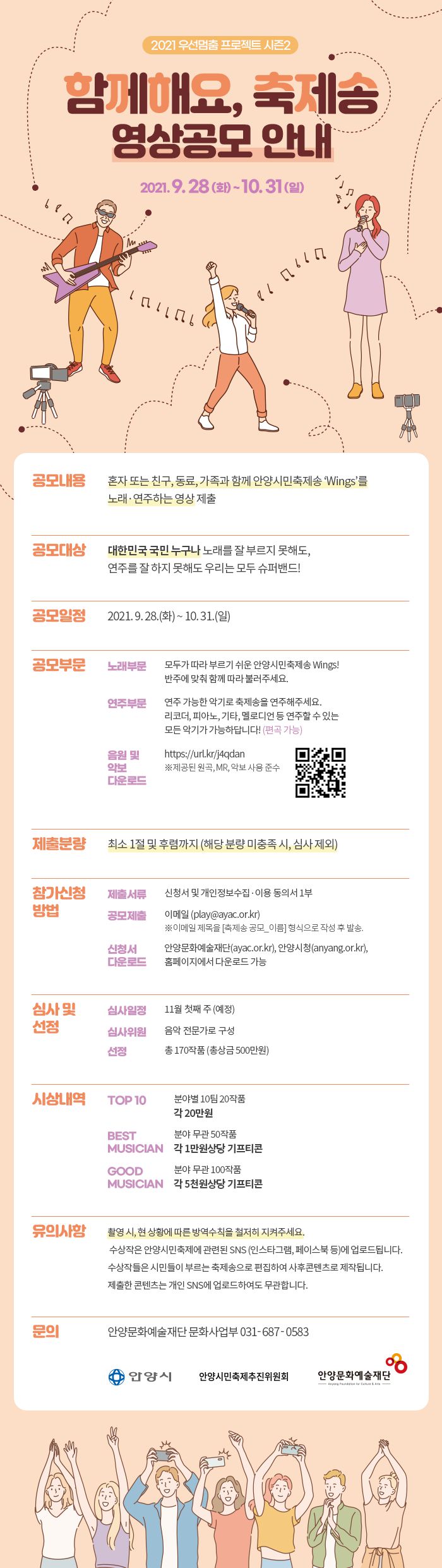 - 혼자 또는 친구, 동료, 가족과 함께 안양시민축제송 ‘Wings’를 노래ㆍ연주하는 영상 제출
