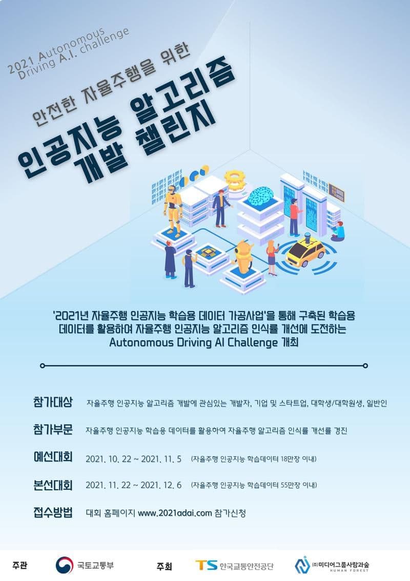 2021 Autonomous Driving A.I. challenge는 '자율주행 인공지능 학습용 데이터 가공사업'을 통해 구축된 학습용 데이터를 활용하여 자율주행 인공지능 알고리즘 인식률 개선에 도전하는 자율주행 인공지능 알고리즘 개발 챌린지 대회입니다.