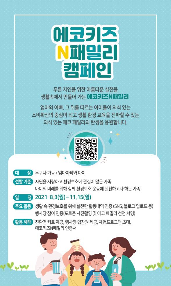 🌱지구를 사랑하는 마음으로 생활 속 환경보호를 위해 깨끗한 친환경 활동을 실천하는 착한 마음의 <에코키즈N패밀리>참가자를 모집합니다.🌿