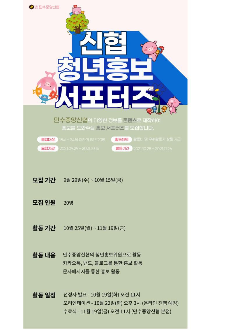 만수중앙신협의 다양한 정보를 콘텐츠로 제작하여 홍보를 도와주실 홍보 서포터즈를 모집합니다.