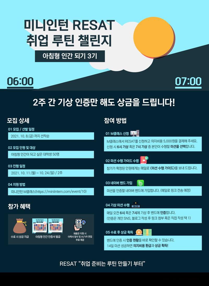 [오픈놀]일찍 일어나고 싶은 분? 취업 준비는 루틴 만들기 부터! RESAT 아침형 인간 되기 모집(~10/8)