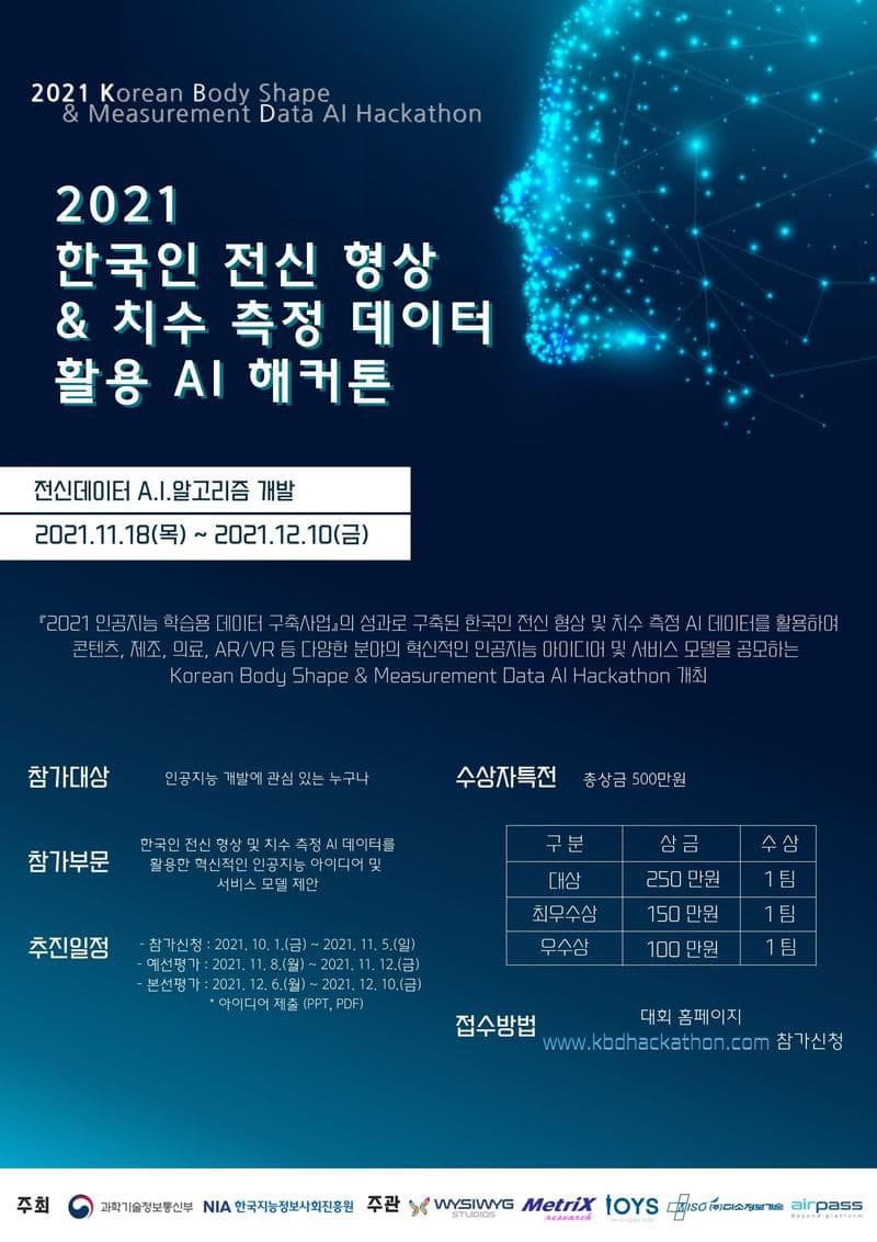 『2021 인공지능 학습용 데이터 구축사업』의 성과로 구축된 한국인 전신 형상 및 치수 측정 AI 데이터를 활용하여 콘텐츠, 제조, 의료, AR/VR 등 다양한 분야의 혁신적인 인공지능 아이디어 및 서비스 모델을 공모하는 해커톤 입니다.