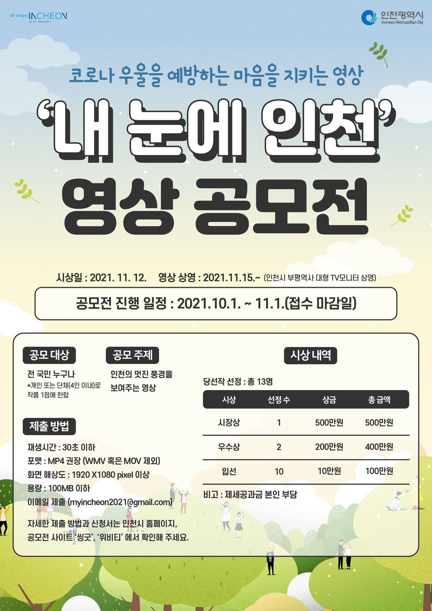 ■ 제출방법 : 아래 첨부파일 (공고문 및 참가서류) 확인하여 이메일 제출(myincheon2021@gmail.com)