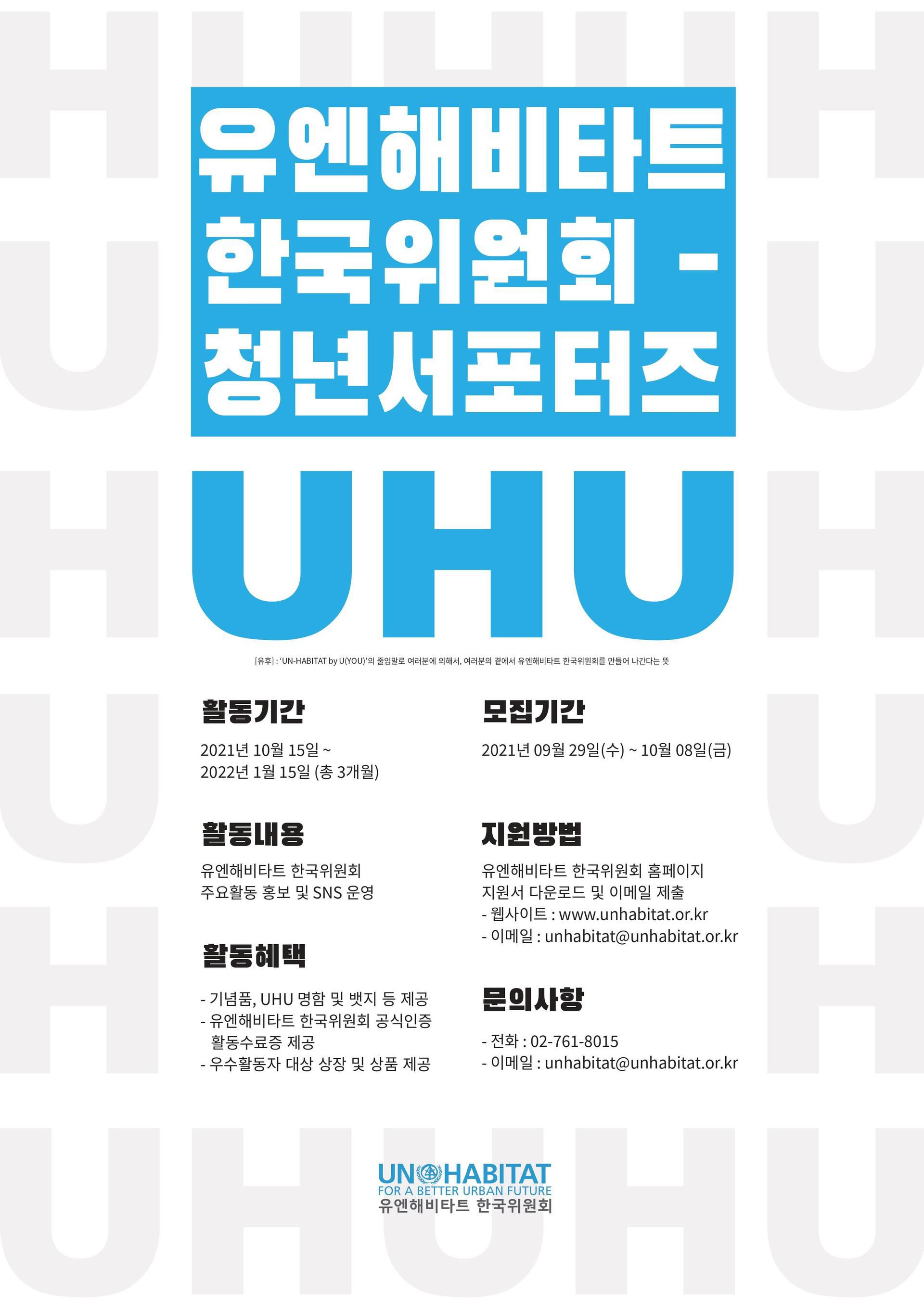 UN 산하에서 지속가능한 도시와 인간정주 분야를 관장하는 국제기구 UN-HABITAT의 첫 국가위원회 ‘유엔해비타트 한국위원회(Korean National Committee for UN-HABITAT)’를 함께 만들어갈 청년 서포터즈 ‘UHU(UN-HABITAT by You)’를 모집합니다.