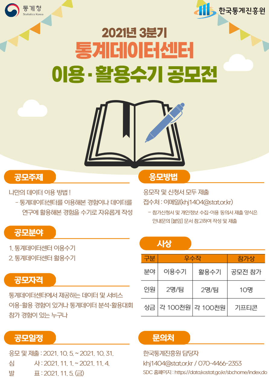 (첨부된 문서 '2021년 3분기 통계데이터센터 이용·활용수기 공모 안내문' 참고하여 작성)