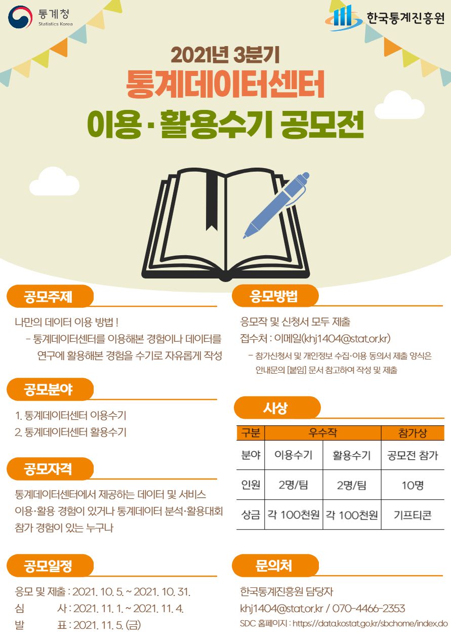통계청에서 『통계데이터센터 이용 · 활용 수기 공모전』을 개최하오니, 관심 있는 분들의 적극적인 참여를 바랍니다.