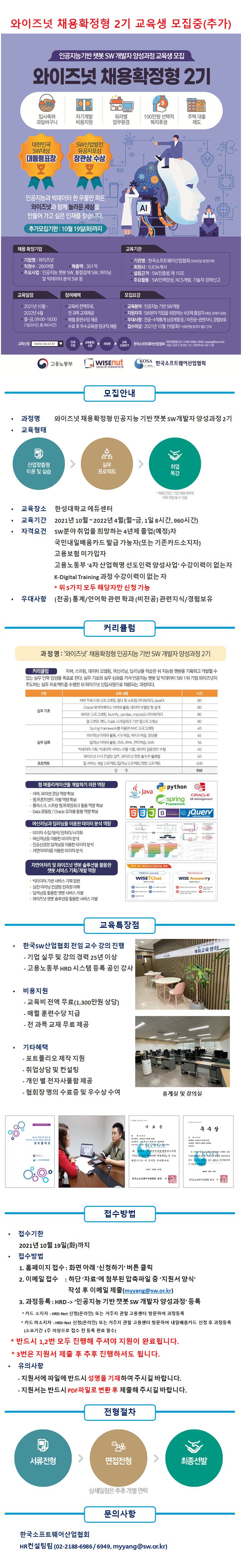 본 협회에서는 와이즈넛 채용확정형 인공지능 기반 챗봇 SW 개발자 양성과정 2기 교육생을 모집합니다.