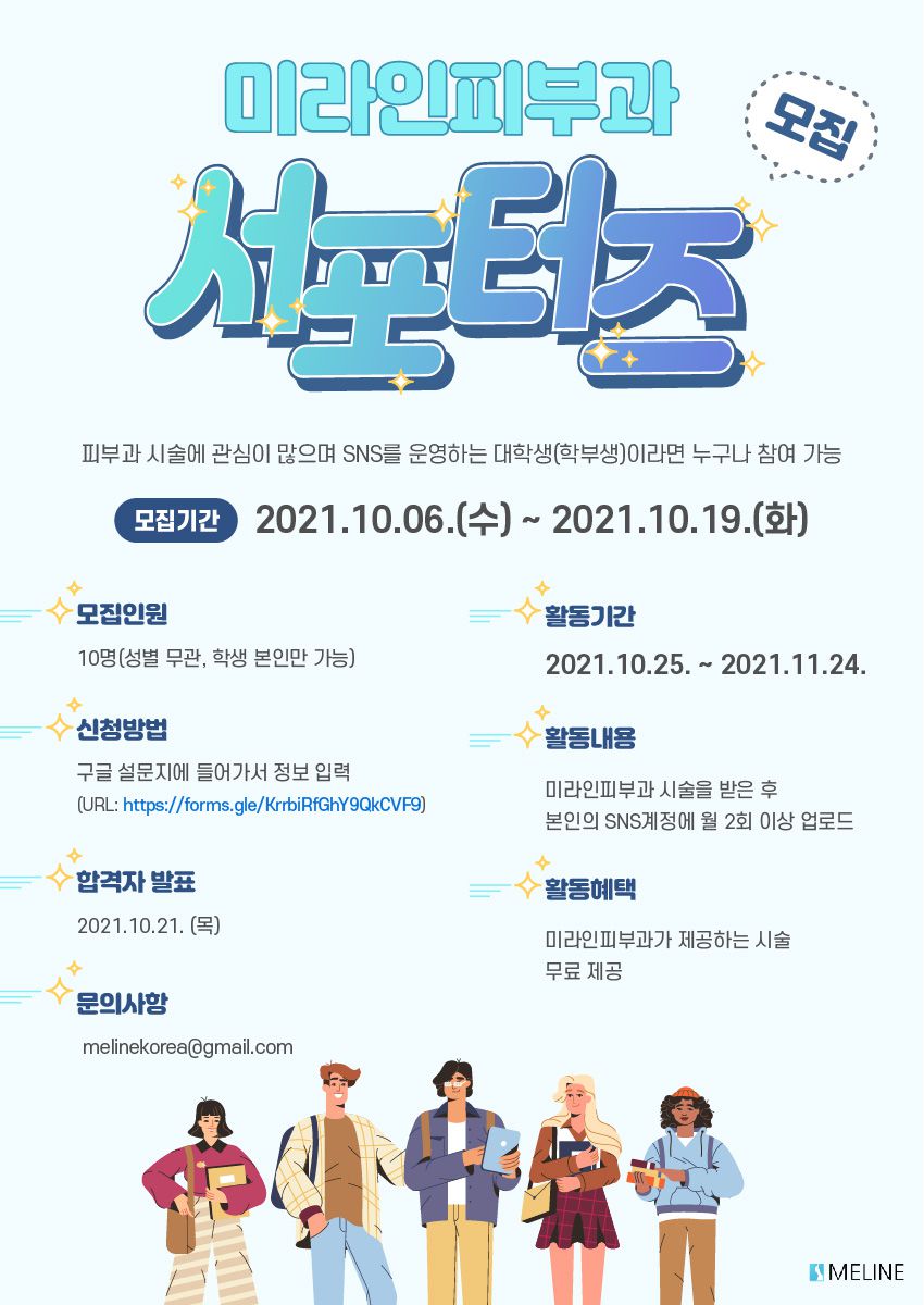 미라인피부과는 대학생 여러분이 보다 더 찬란한 청춘을 만들 수 있도록 대학생 서포터즈를 진행하게 되었습니다.