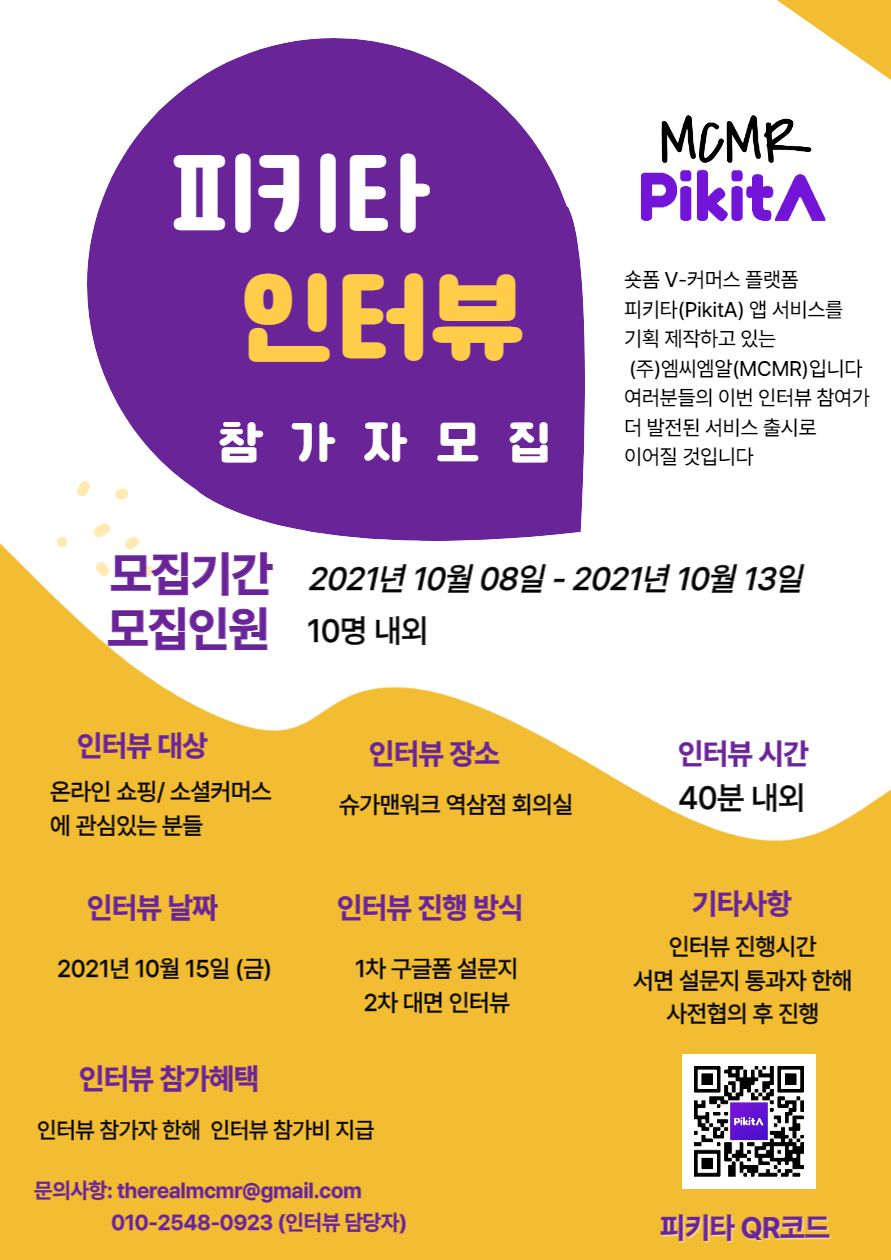 숏폼 V-커머스 플랫폼 피키타(PikitA) 앱 서비스를 기획 제작 하고 있는 (주)엠씨엠알(MCMR)입니다. 여러분들의 이번 인터뷰 참여가 더 발전된 서비스 출시로 이어질 것입니다.