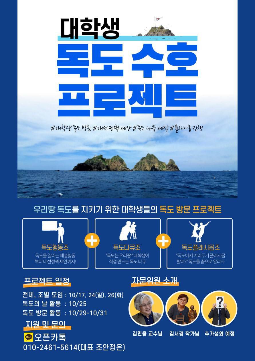 ⛰10월 25일은 독도의 날! 독도의 날을 맞아 독도를 지키기 위해서 10.29(금)~10.31(일) 대학생들이 독도를 방문합니다. 정치인, 교수 자문위원과 함께 독도를 방문해, 독도를 지키는 활동을 할 대학생을 모집합니다.