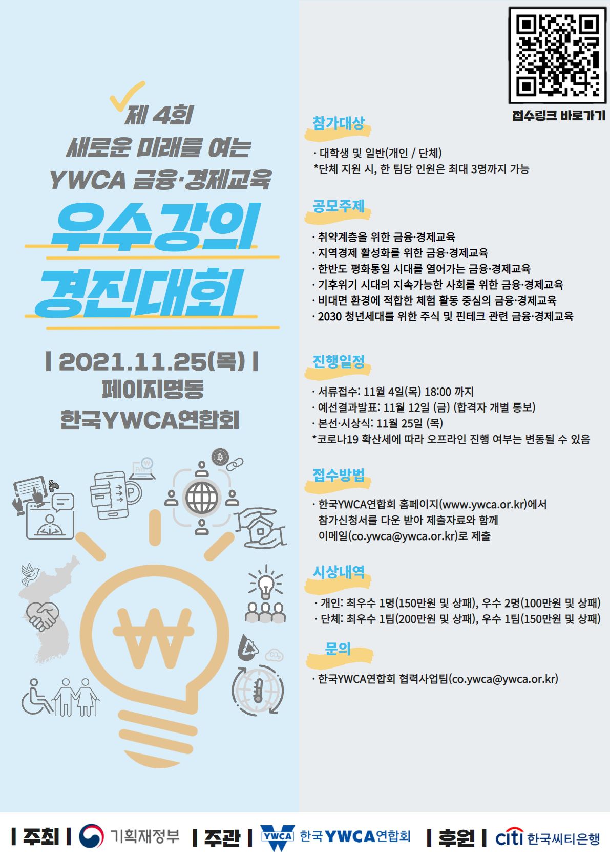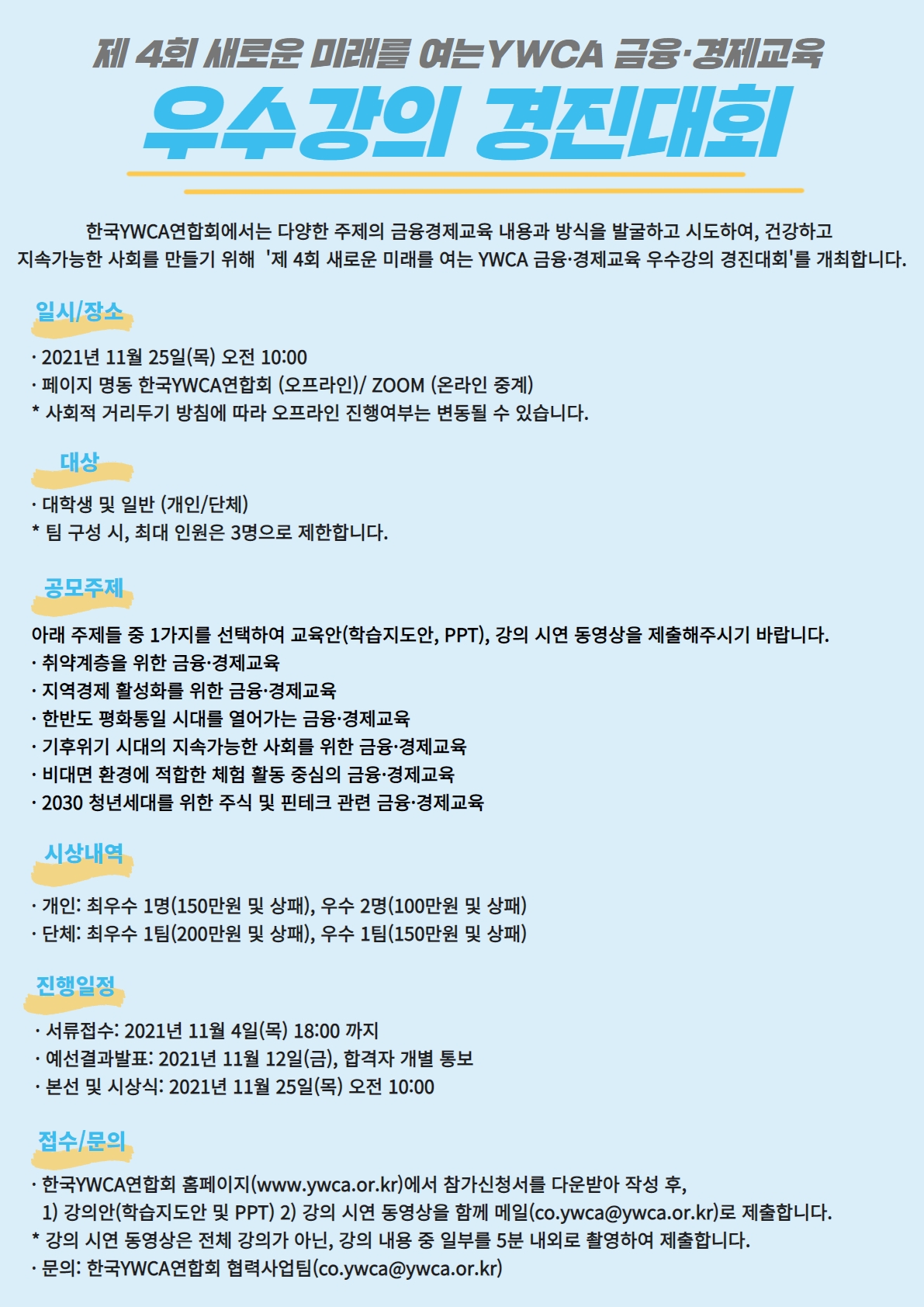 한국YWCA연합회에서는 다양한 주제의 금융·경제교육 내용과 방식을 발굴하고 시도하여, 건강하고 지속가능한 사회를 만들기 위한 제 4회 새로운 미래를 여는 YWCA 금융·경제교육 우수강의 경진대회를 개최합니다.