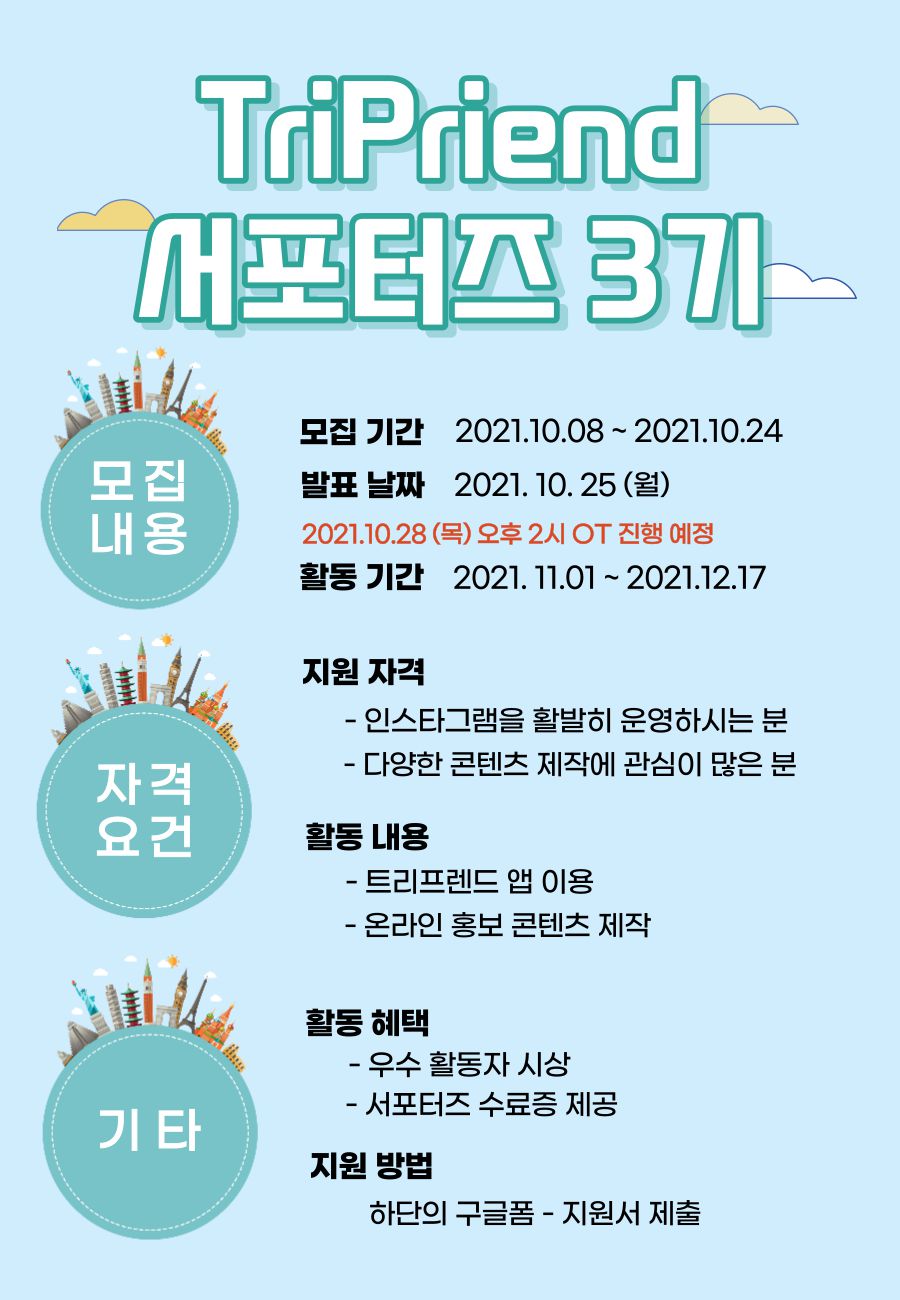약 7주간의 활동으로 다양한 사람과 소통하며 재미있는 주제를 주어진 콘텐츠를 제작하여 트리프렌드를 홍보하실 분들을 모집합니다!