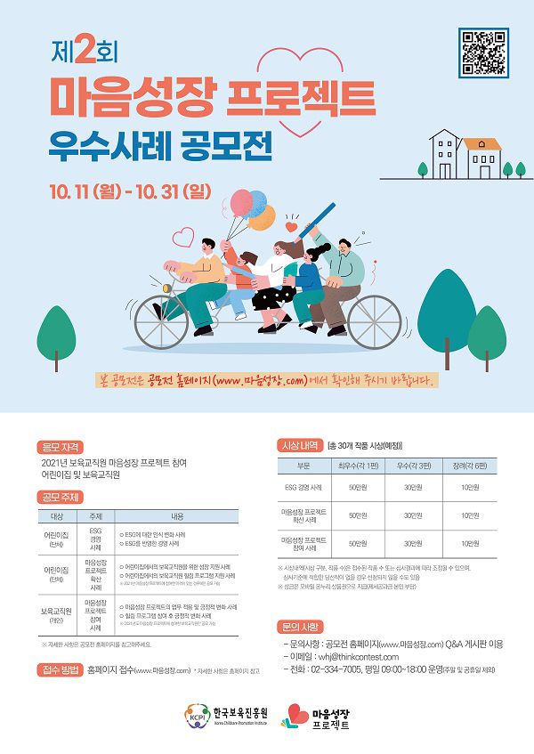 ㅇ 마음성장 프로젝트의 업무 적용 및 긍정적 변화 사례 - 마음성장 프로젝트 참여 후 업무 내 적용 및 실천 노력 - 적용 후 개인 또는 원내 긍정적 변화 및 어려움 극복 사례 등 ㅇ 힐링 프로그램 참여 후 긍정적 변화 사례 - 힐링 프로그램 참여 후기, 나만의 특별한 힐링 방법 등 - 코로나 우울 및 직무 스트레스 완화 사례 등 ※ 2021년도 마음성장 프로젝트에 참여한 보육교직원만 공모 가능