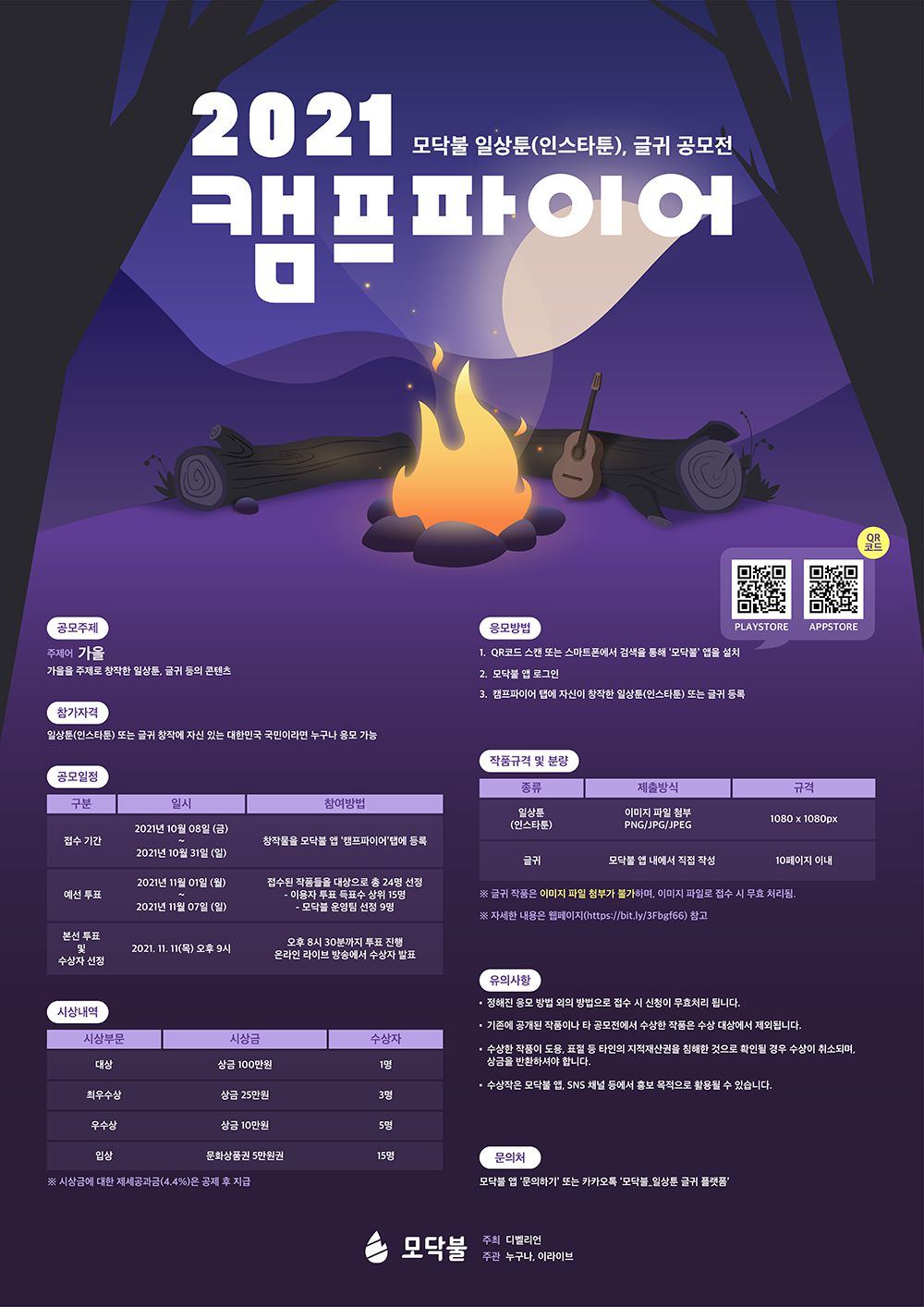 - 수상작은 모닥불 앱, SNS 채널 등에서 홍보 목적으로 활용될 수 있습니다.