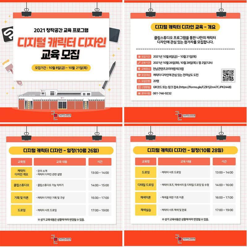 전남콘텐츠코리아랩에서 운영하는 디지털 캐릭터 디자인 교육 참가자를 모집합니다! 클립스튜디오 프로그램을 통한 나만의 캐릭터 디자인에 관심이 있는 참가자를 모집하고 있습니다. 많은 참여 부탁드립니다.