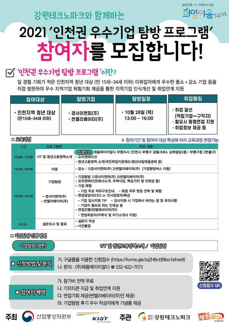 안녕하세요~ 인천 청년구직자 대상으로 중소기업탐방 프로그램 참여자를 모집합니다.