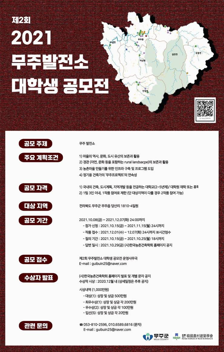 무주군 농촌다운 복원사업의 일환으로 무주군과 (사)한국농촌건축학회와 공동으로 ‘2021 무주발전소 대학생 공모전’을 실시합니다.