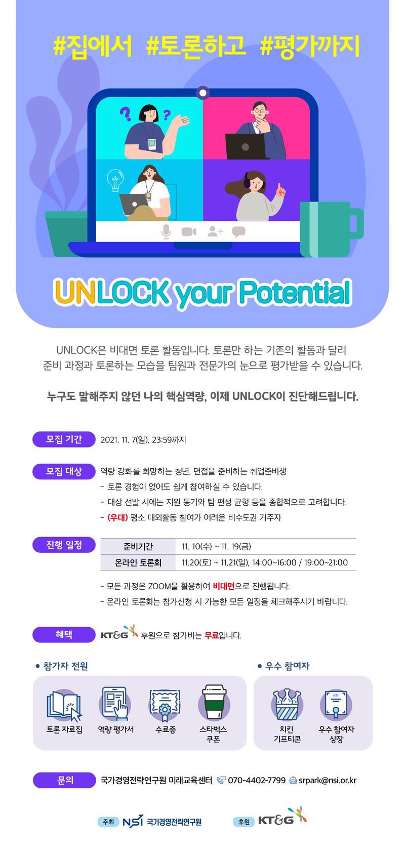 - 자세한 내용은 국가경영전략연구원(NSI) 홈페이지 "UNLOCK 소개자료"를 참고해 주시기 바랍니다.