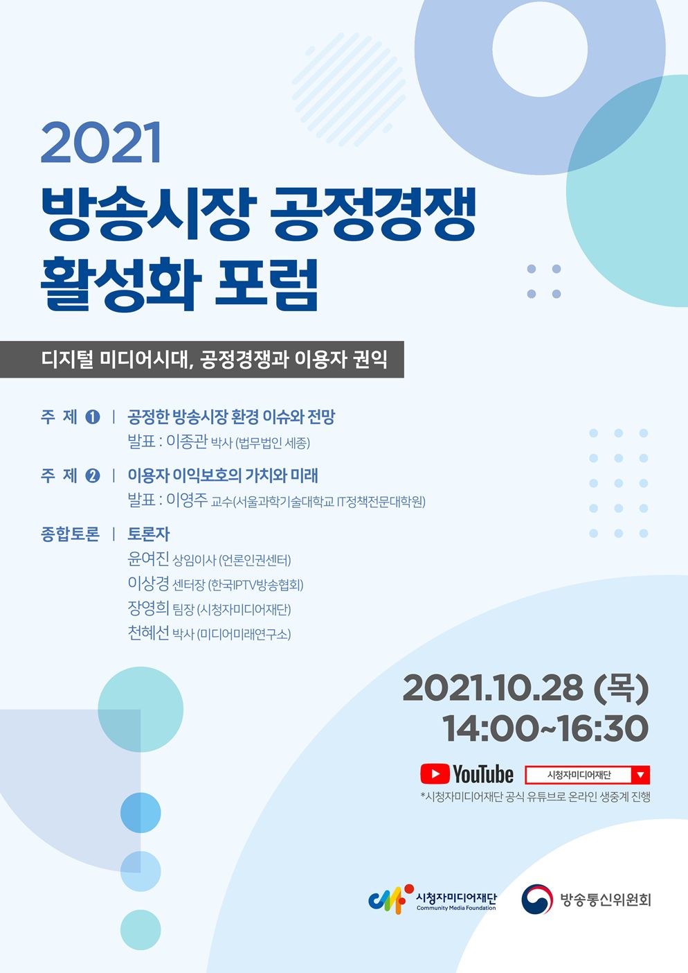 시청자미디어재단은 방송시장의 공정한 경쟁질서 확립과 더불어 미디어 이용자 권익 보호라는 공감대 확산을 위한 2021 방송시장 공정경쟁 활성화 포럼을 개최합니다.