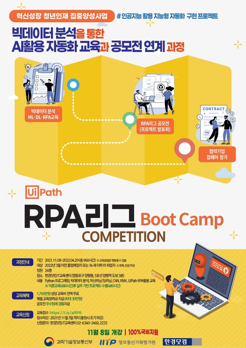 - 자연어 처리에 들어가는 다양한 이론 및 알고리즘에 대해 학습하고, 최종적으로 해당 알고리즘을 코드로 구현 실무 프로젝트를 통해 AI와 UiPath RPA플랫폼을 활용한 업무 자동화 구현 프로젝트를 진행해 기업이 필요로 하는 자동화 전문인력 양성 및 채용연계 지원