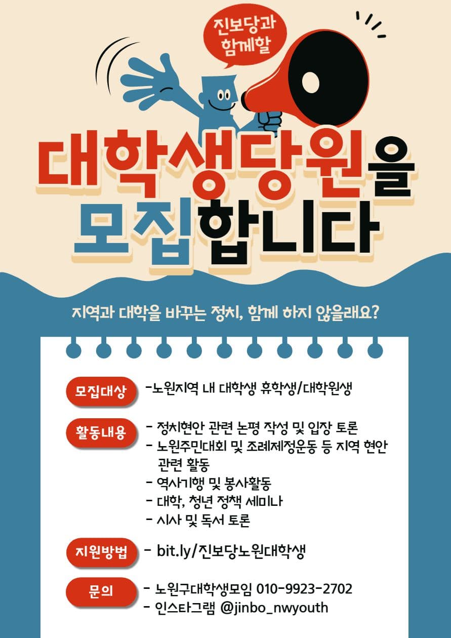 안녕하세요. 진보당 노원지역 대학생 당원모임입니다.