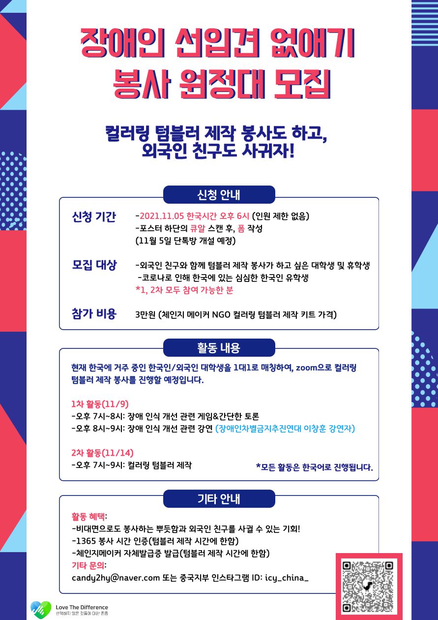 장애인 선입견 없애기 봉사 원정대 모집—컬러링 텀블러 제작 봉사도 하고, 외국인 친구도 사귀자!