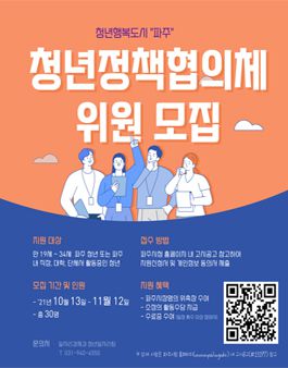 파주시 일자리경제과 청년일자리팀에서 수혜자 중심의 청년정책 발굴을 위해 「파주시 청년정책협의체」 위원을 공개모집합니다.