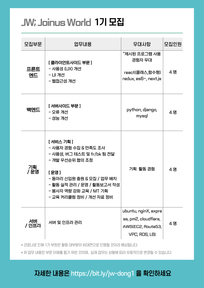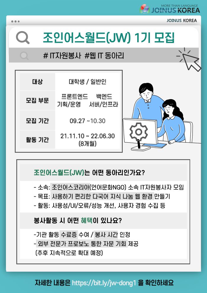 ์น '์กฐ์ธ์ด์ค์๋'์ ์ํํธ์จ์ด ์์ ์ญํ ์ ๋ด๋นํ๋ ์ฌ๋ฌด๊ตญ ์์ <์น ํน์ ํ๋>์ ์์จ ๋์๋ฆฌ๋ก ์ ํํ์ฌ ์ฃผ์ฒด์ /์์จ์ /์์น์ ์ผ๋ก ํ๋ํ ์ ์๋ ํํ๋ก ํธ์ฑํ๊ณ ์ ํฉ๋๋ค. ์๋ก ์ฐฝ์ค๋๋ ์กฐ์ธ์ด์ค์๋(JOINUS WORLD)๋ฅผ ํตํด ์น ํ๋ก์ ํธ ๊ฒฝํ์ ๋๋ฆด ๋ฟ๋ง ์๋๋ผ, ๊ตญ์ ๊ต๋ฅ ๋ฐ ์ธ๊ต์๋ ๊ธฐ์ฌํ ์ ์๊ธฐ๋ฅผ ๊ธฐ๋ํฉ๋๋ค.
