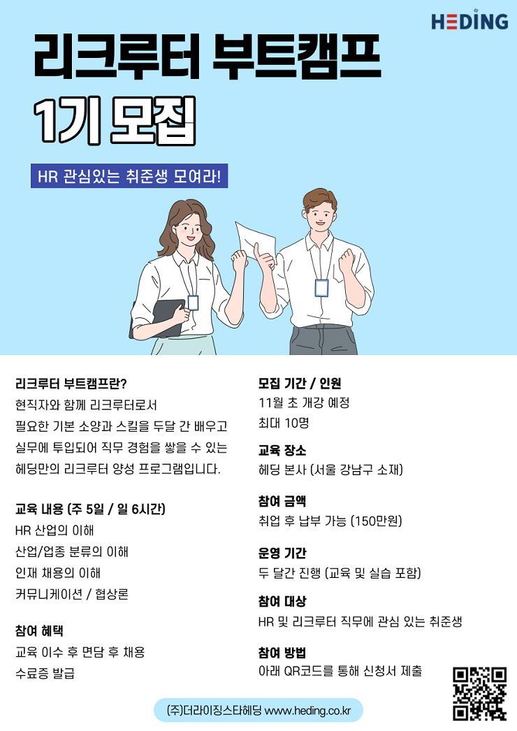 리크루터 부트캠프는 저희 헤딩에서, HR 산업 진출을 희망하는 취준생 분들, 이직을 희망하시는 분들께 산업에 대한 이해와 리크루터 업무 전반을 교육하고 실무 경험도 쌓을 수 있도록 도와주는 교육 프로그램입니다.