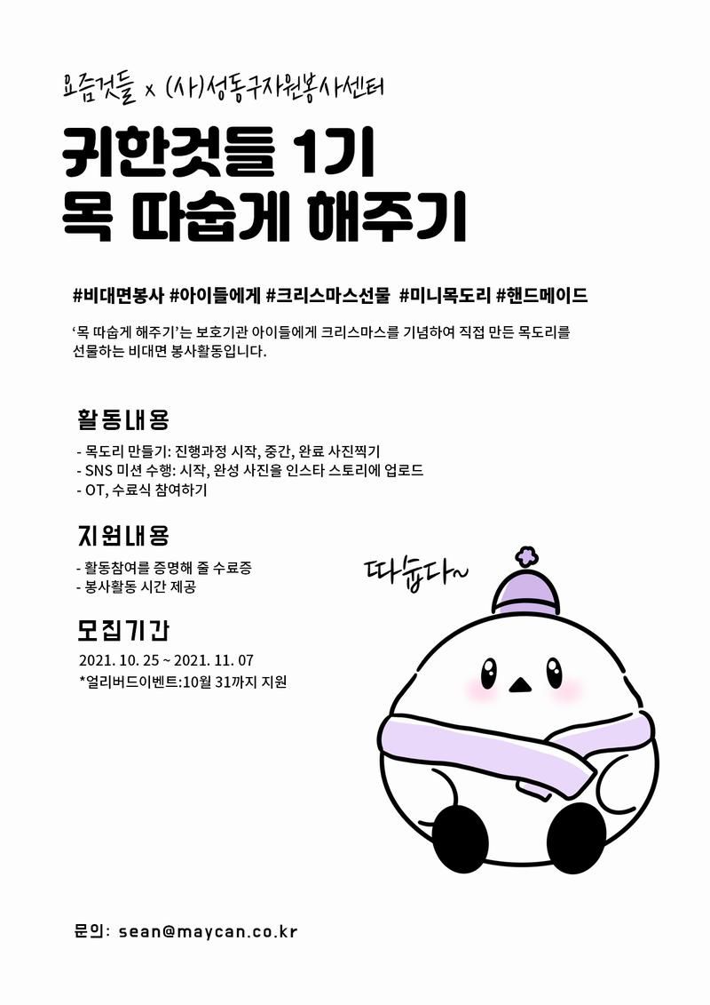 아동 청소년 관련 보호기관의 아이들에게 직접 만든 핸드메이드 미니목도리를 선물하는 비대면 봉사입니다. 요즘것들에서 준비한 미니목도리 키트를 제공받고 목도리를 완성하여 다시 요즘것들에 전달해주시면 (사) 성동구자원봉사센터를 통해 보호기관의 아이들에게 전달됩니다.