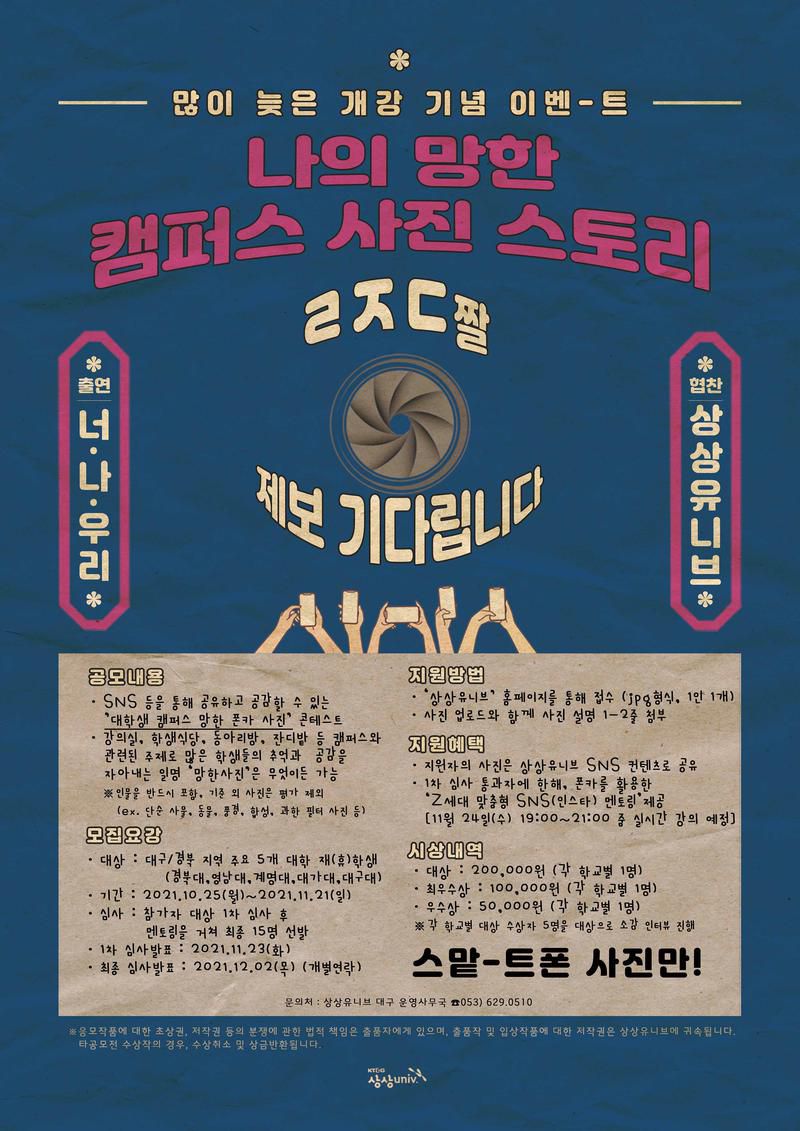 - 강의실, 학생식당, 동아리방 등 캠퍼스와 관련된 주제로 추억과 공감을 자아내는 '망한 폰카 사진' 제출