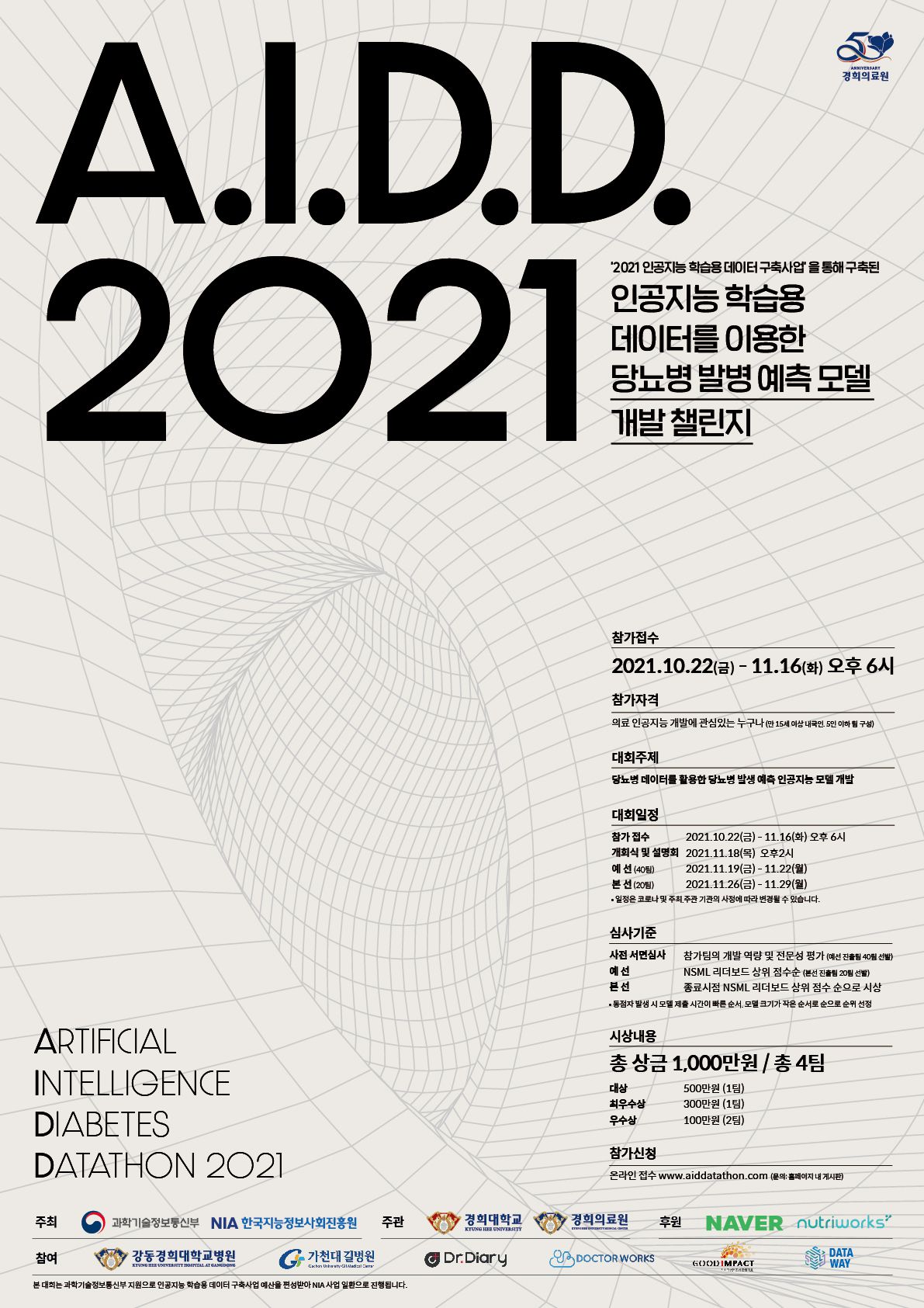 A.I.D.D. 2021은 '2021년도 인공지능 학습용 데이터 구축사업'을 통해 구축된 인공지능 학습용 당뇨병 및 합병증 추적관찰 임상 데이터를 활용하여 당뇨병 발병 예측 AI 모델을 개발하는 데이터톤 대회입니다.