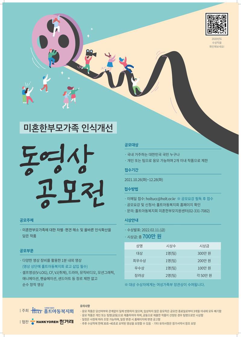 홀트아동복지회 홈페이지 방문(https://love.holt.or.kr) →[참여/신청] 클릭 →[2021년도 미혼한부모가족 인식개선 동영상공모전 개최]클릭→ 공모요강 필독 →신청서와 영상 이메일 접수(holtucc@holt.or.kr)
