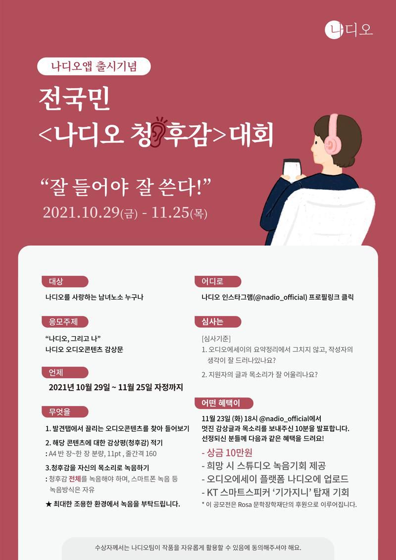 힐링 오디오에세이 플랫폼 나디오에서 앱 서비스 출시를 맞아 《전국민 나디오청(👂)후감 대회》를 개최합니다. 나디오 오디오에세이를 통해 어떻게 위로받고 있는지, 또 어떤 콘텐츠를 재미있게 들으셨는지 궁금합니다.