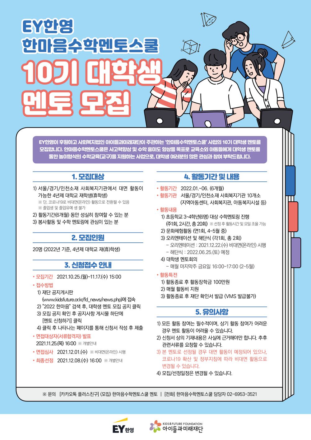2022년 사업에 함께 할 10기 대학생 멘토를 모집하오니 많은 관심과 참여 부탁드립니다.
