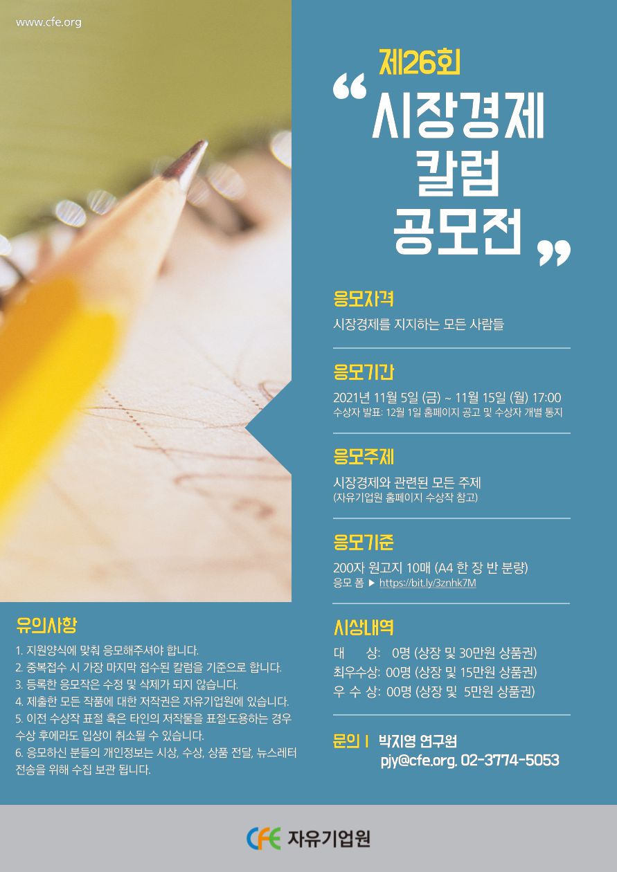 자유기업원이 제26회 시장경제칼럼 공모전을 개최합니다. 시장경제의 눈으로 바라보는 우리의 일상, 여러분의 다양한 생각을 기다립니다!