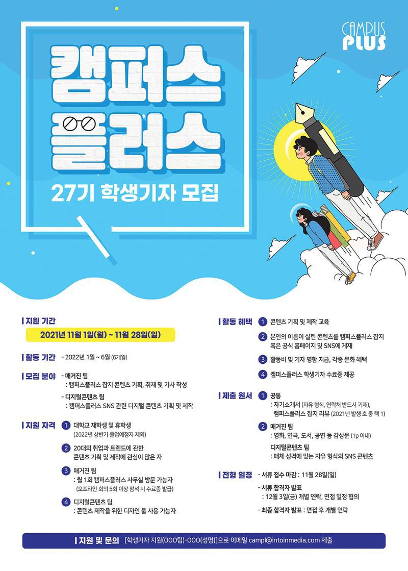 1. 공통 : 자기소개서(자유 형식, 연락처 반드시 기재), 캠퍼스플러스 잡지 리뷰(2021년 발행 호 중 택 1)