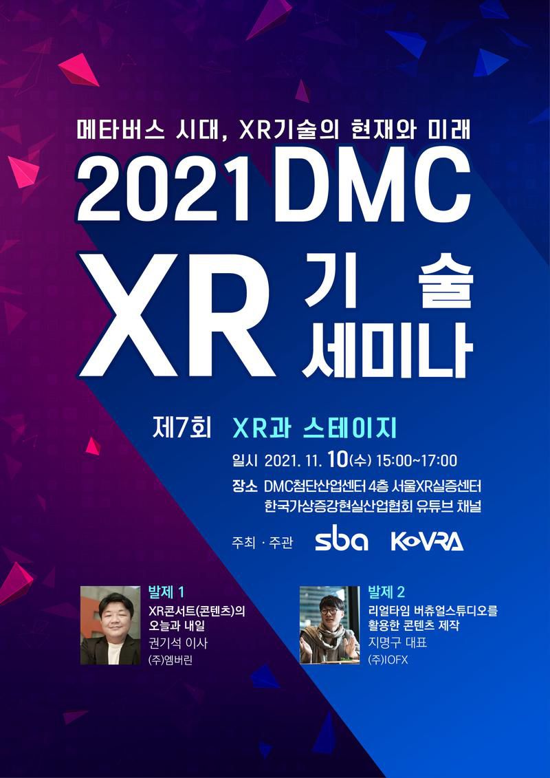 본 협회는 서울산업진흥원과 함께 XR산업의 주요 동향과 국내외 핵심 이슈를 소개하고, 산업계 지식 교류 및 확산을 위해 <2021 DMC XR기술 세미나>를 매월 개최합니다. 11월에는 ‘XR과 스테이지(Stage)’를 주제로 제7회 DMC XR기술 세미나를 아래와 같이 개최하오니 많은 관심과 참여를 부탁드립니다. 감사합니다.