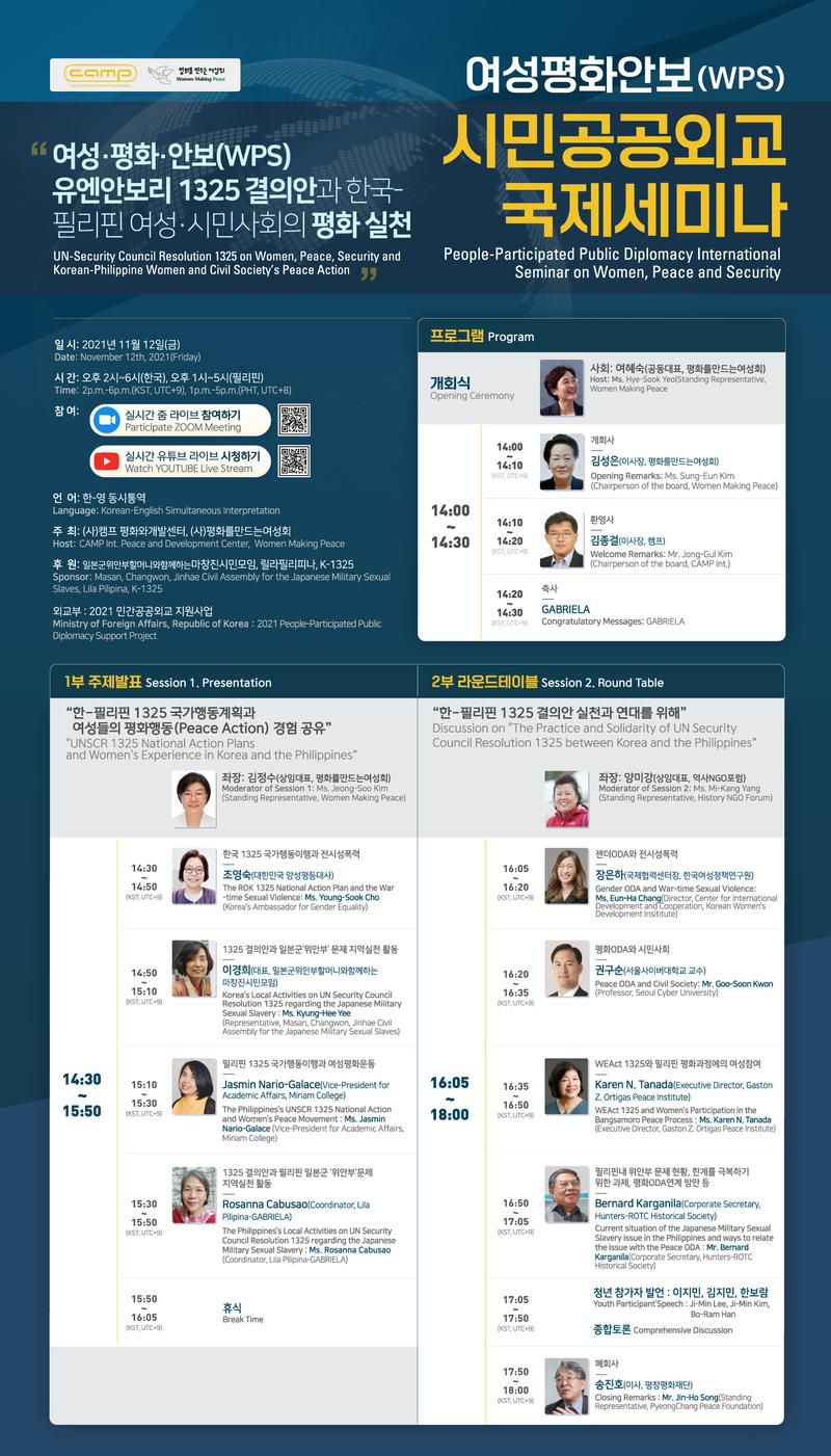 (사)캠프·(사)평화를만드는여성회가 11월 12일 '여성·평화·안보(WPS) 유엔안보리 1325 결의안과 한국-필리핀 여성·시민사회의 평화실천'을 주제로 ‘여성평화안보(WPS) 시민공공외교 국제세미나’를 진행합니다. 여성, 평화, 안보 및 국제개발협력에 관심있는 분들의 많은 참여 바랍니다.