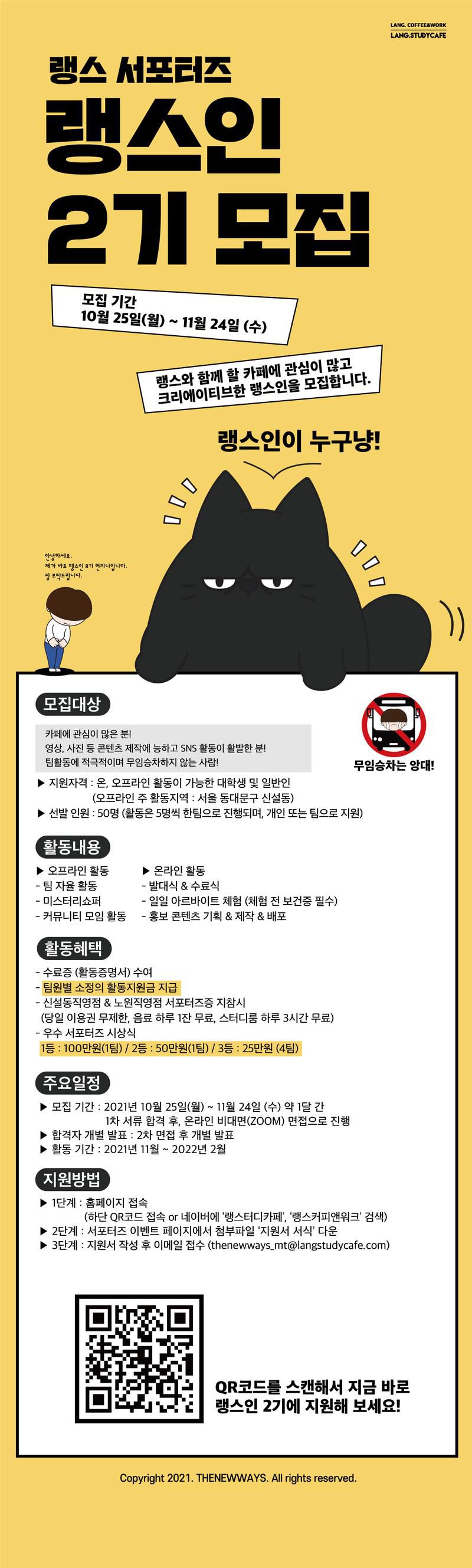 - 1단계 : 홈페이지 접속 (하단 QR코드 접속 or 네이버에 ‘랭스터디카페’, ‘랭스커피앤워크’검색)