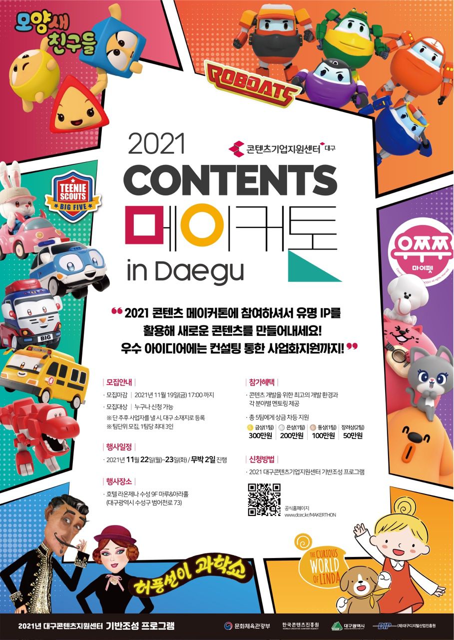 - 2021 CONTENTS 메이커톤 in Daegu는 유명 IP를 활용하여 신규 콘텐츠 아이디어를 발굴하고, 사후 컨설팅을 통하여