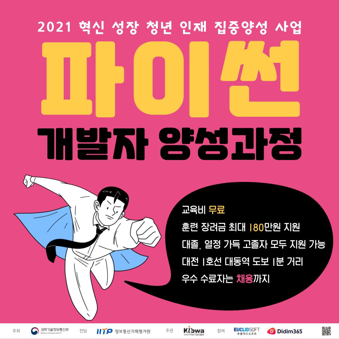 - ‘파이썬 개발자 양성과정’은 과학기술정보통신부가 주최하고 정보통신기획평가원이 전담하며, 유클리드소프트가 참여하는 2021 혁신성장 청년 인재 집중 양성 사업입니다.