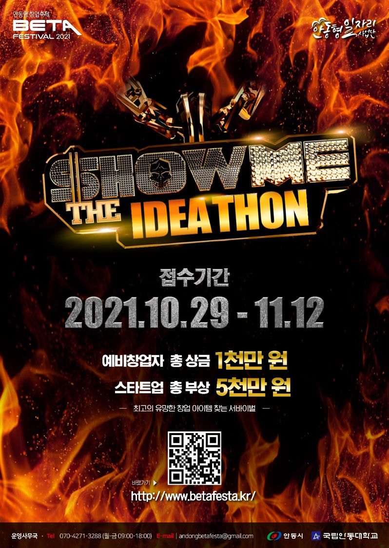『2021 BETA 페스티벌』 아이디어톤은 안동시가 주최하고 안동대학교가 주관하는 대회로서, 지역의 창의적인 아이디어를 가진 예비 창업자를 발굴하고, 집중 지원을 통해 성공사례로 육성하여 창업 붐 확산 및 일자리 창출에 기여하기 위해 마련되었습니다. 자세한 공모 요강은 아래를 참고하시기 바랍니다.