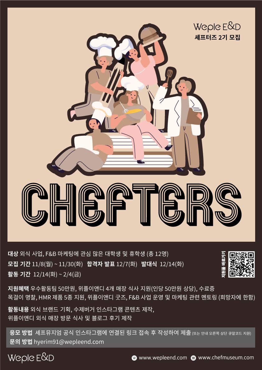 외식, 셰프 매니지먼트, HMR 사업 등을 운영하고 있는 (주)위플이앤디에서 다음과 같이 서포터즈를 모집합니다.