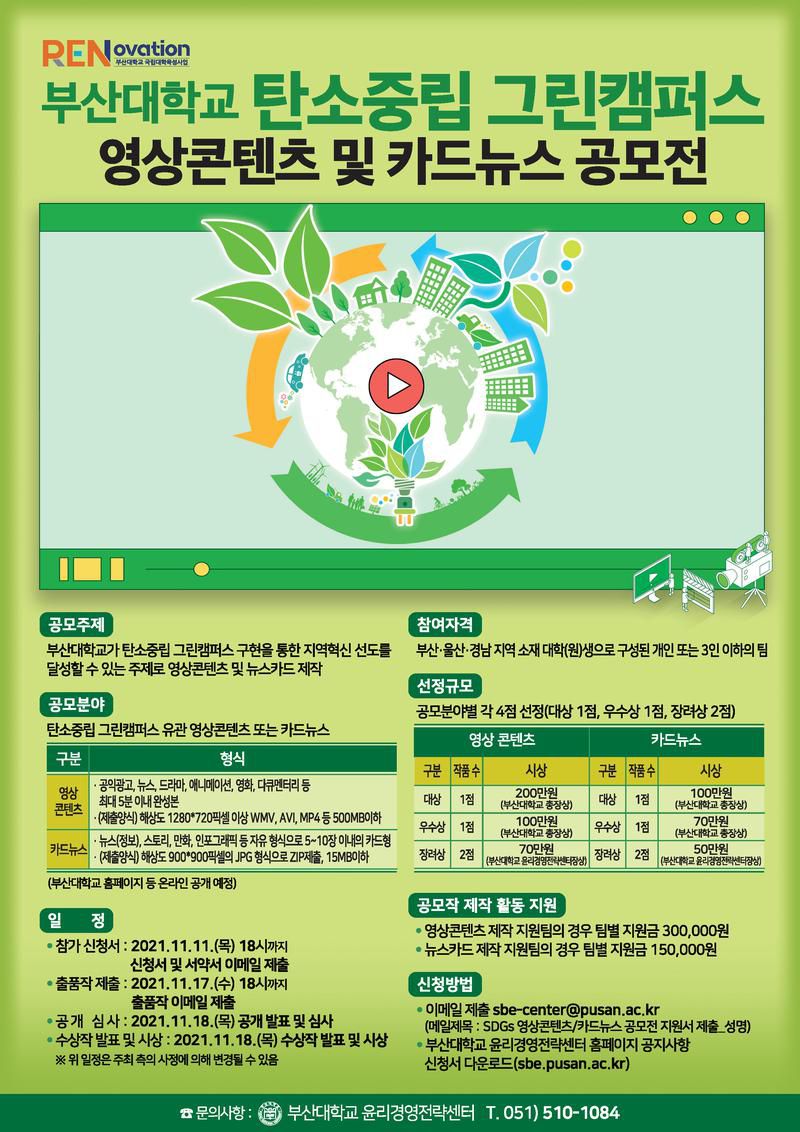 - 부산대학교가 탄소중립 그린캠퍼스 구현을 통한 지역혁신 선도를 달성할 수 있는 주제로 영상콘텐츠 및 뉴스카드 제작
