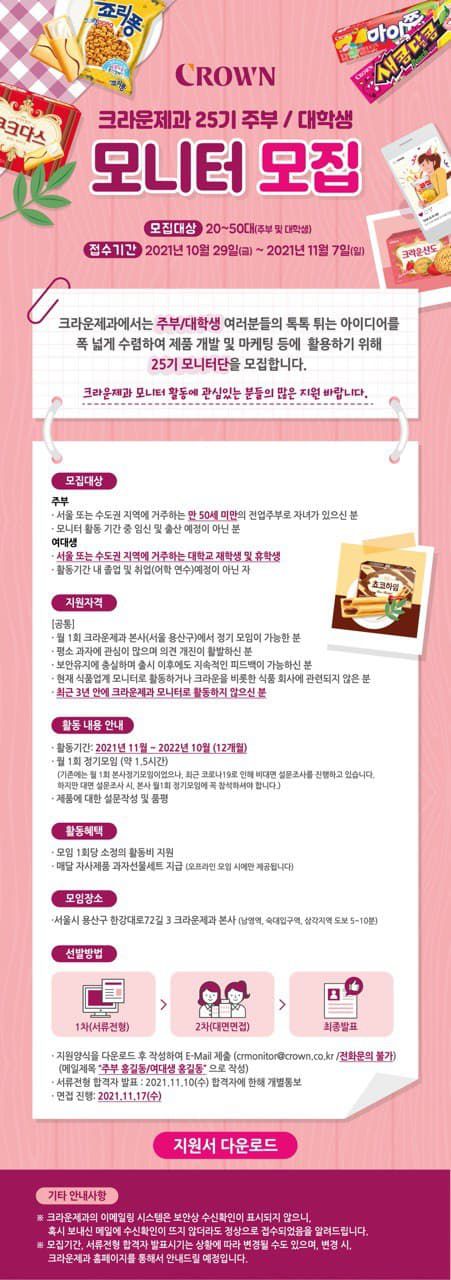 크라운제과 모니터 활동에 관심있는 분들의 많은 지원 바랍니다.