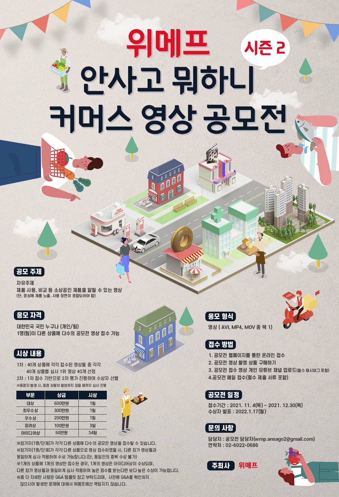 - 본 공모전은 위메프의 공모전 수탁자인 ㈜ 피아미디어그룹이 운영하며, 공모전 수상 및 관련이슈 상황 발생 시 별도로 연락을 드릴 예정입니다.