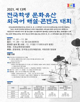국제교류문화진흥원에서는 전국의 초․중․고·대학생이 우리나라의 문화유산을 외국어로 해설하는「2021, 제13회 전국학생 문화유산 외국어 해설·콘텐츠 대회」를 비대면 온라인으로 개최합니다.